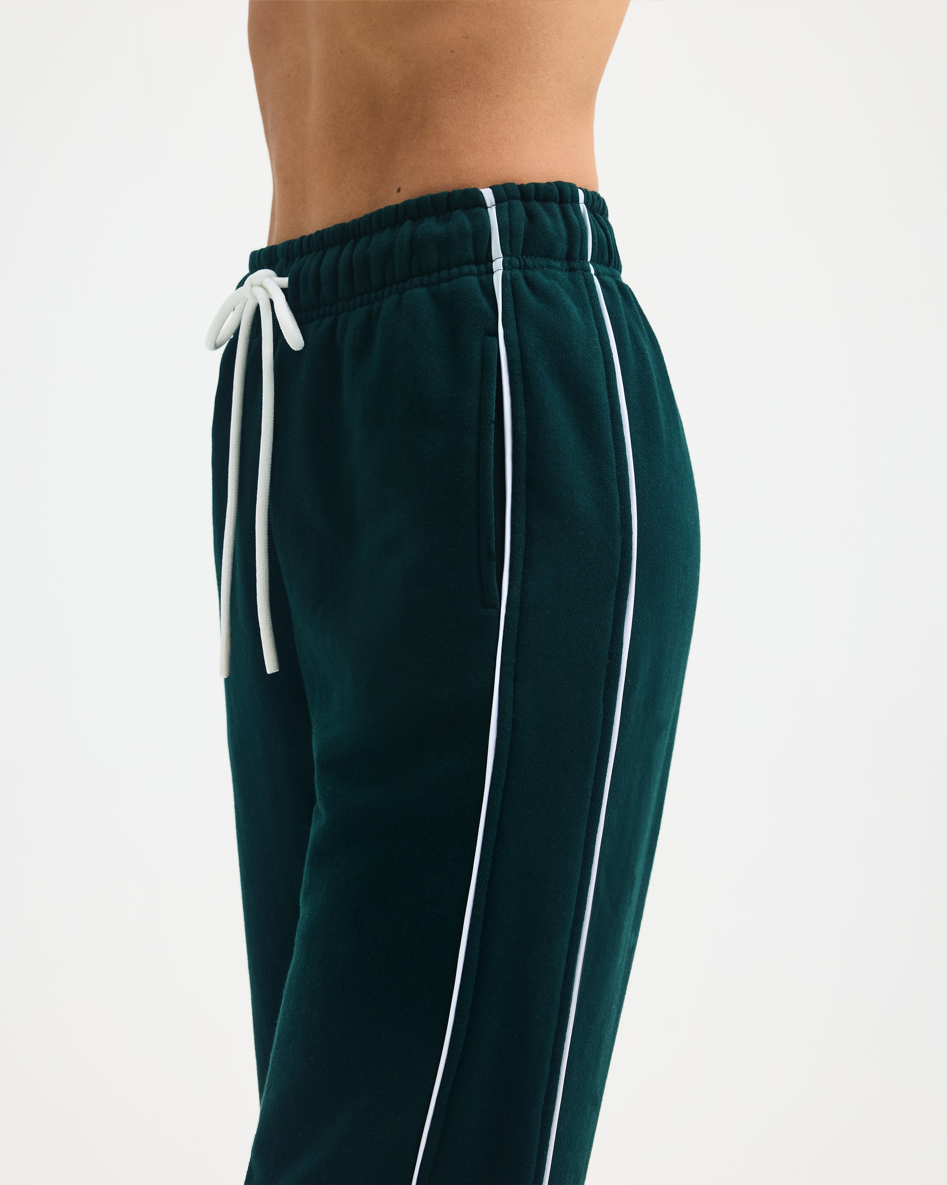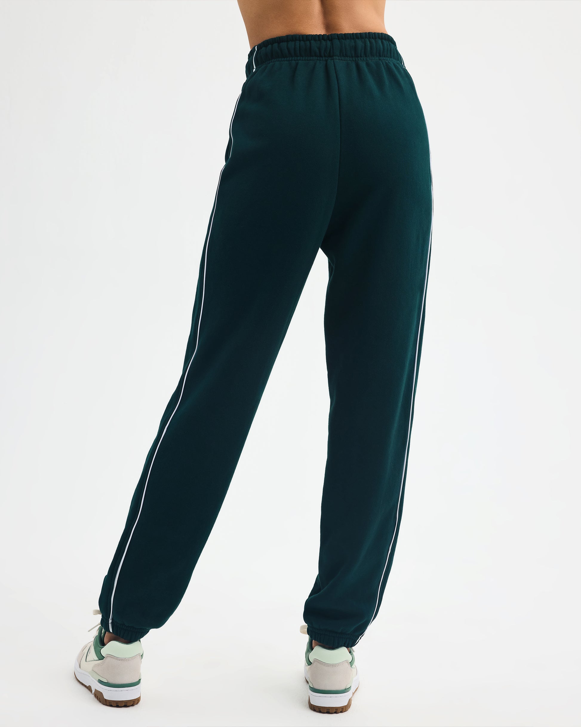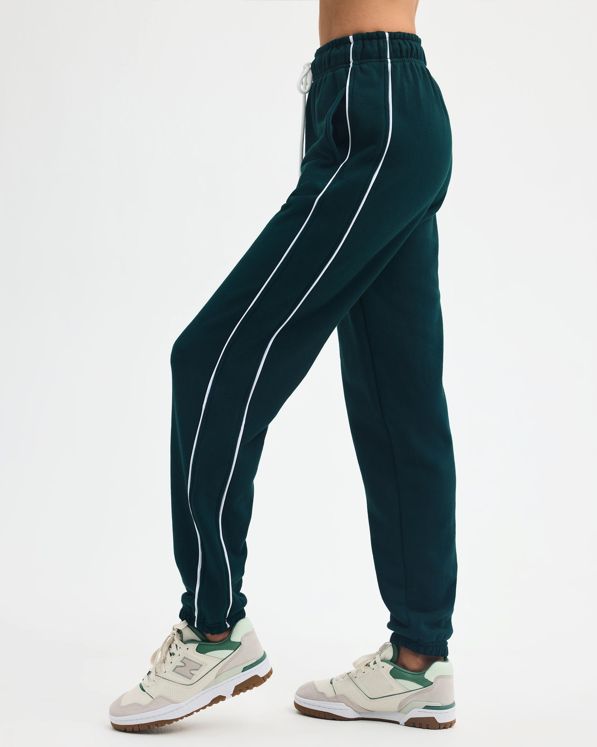 This retro style pant is sure to be on regular rotation. Made from 100% cotton fleece, this medium weight jogger features an elastic waistband and drawstrings, along with retro piping details on the side. Regular fit. Runs true to size.