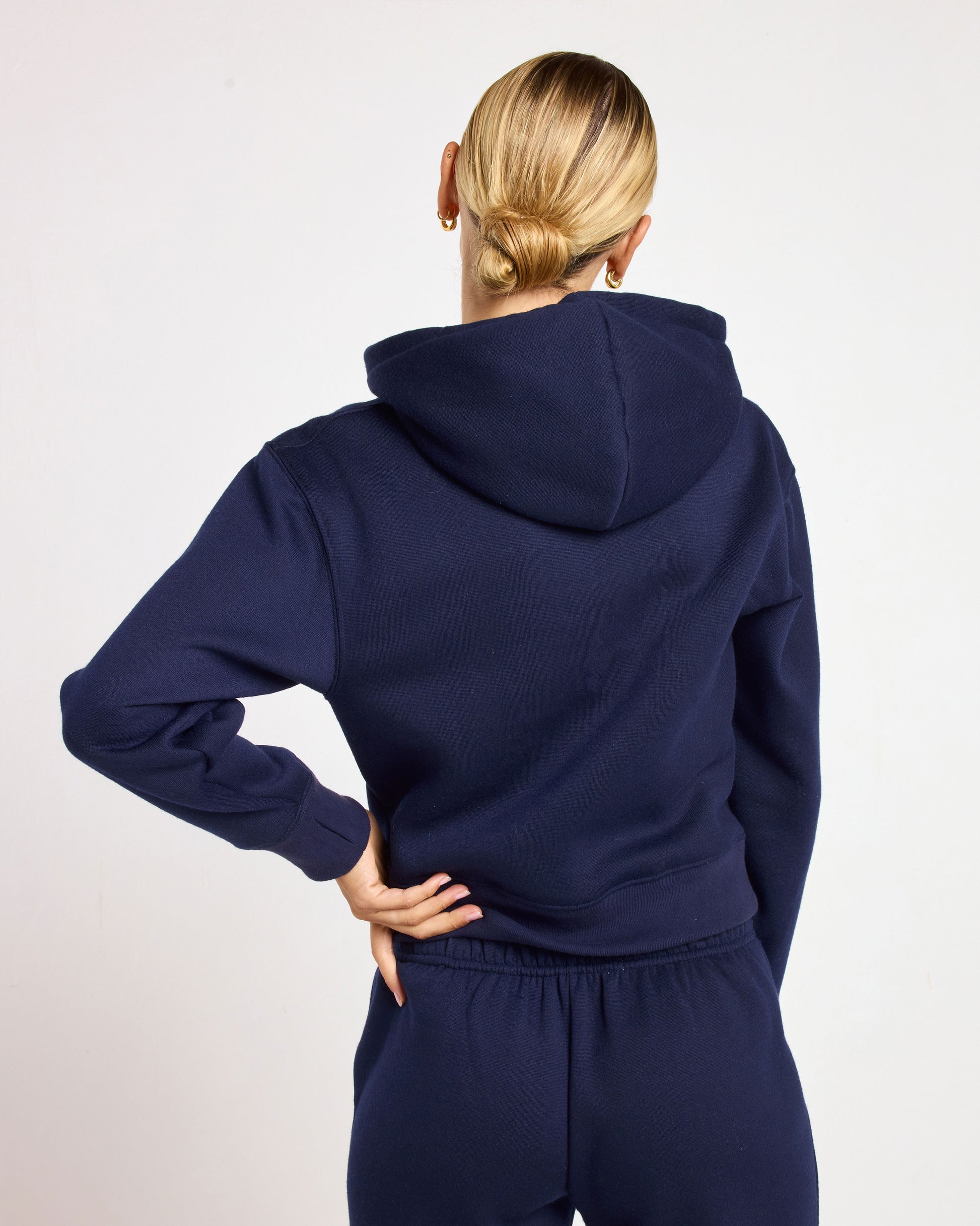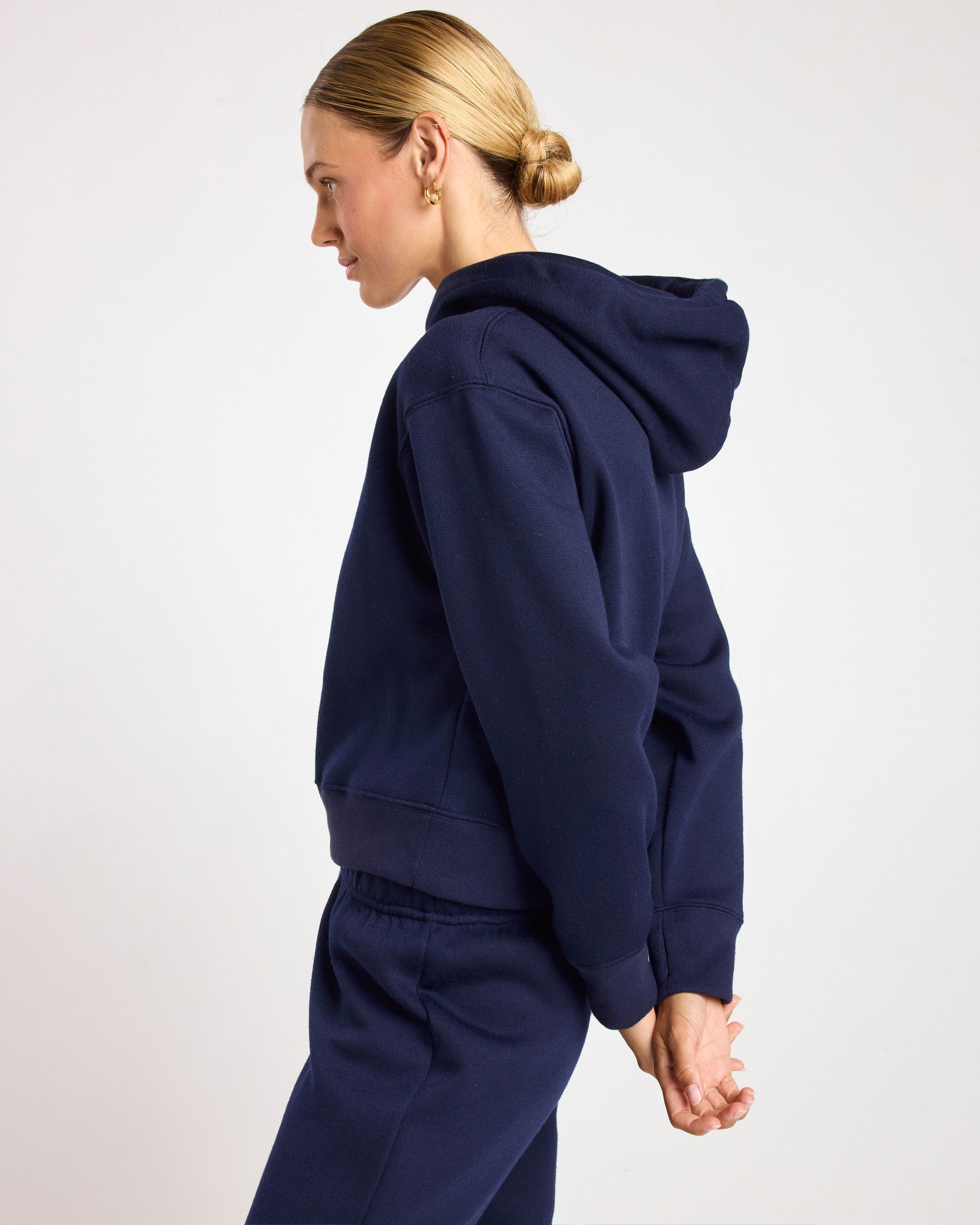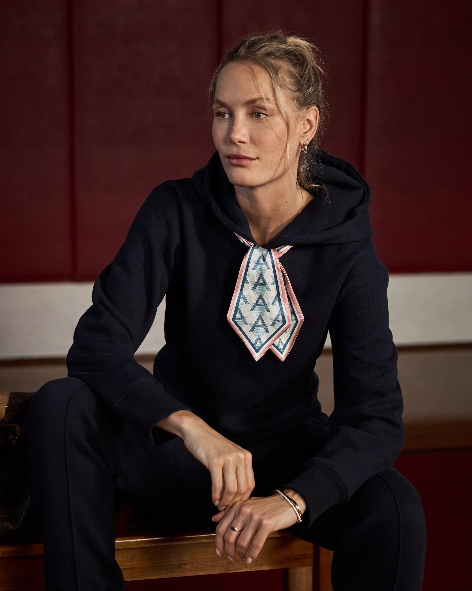 The classic hoodie just got an upgrade. Slightly cropped and slim fit hoodie featuring a custom Ayda print silk scarf for a luxurious accent. Made from super soft fleece for a side of cozy comfort.