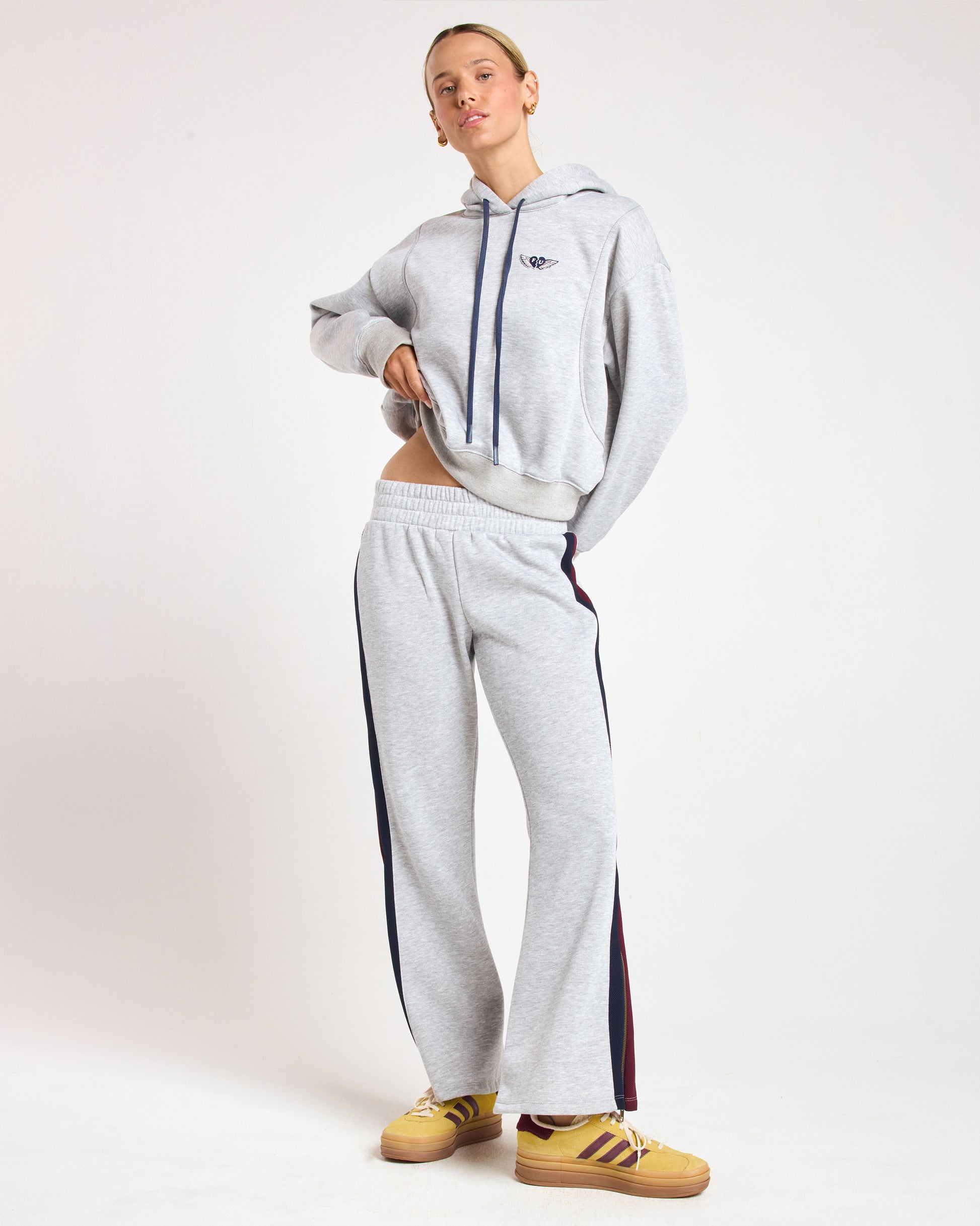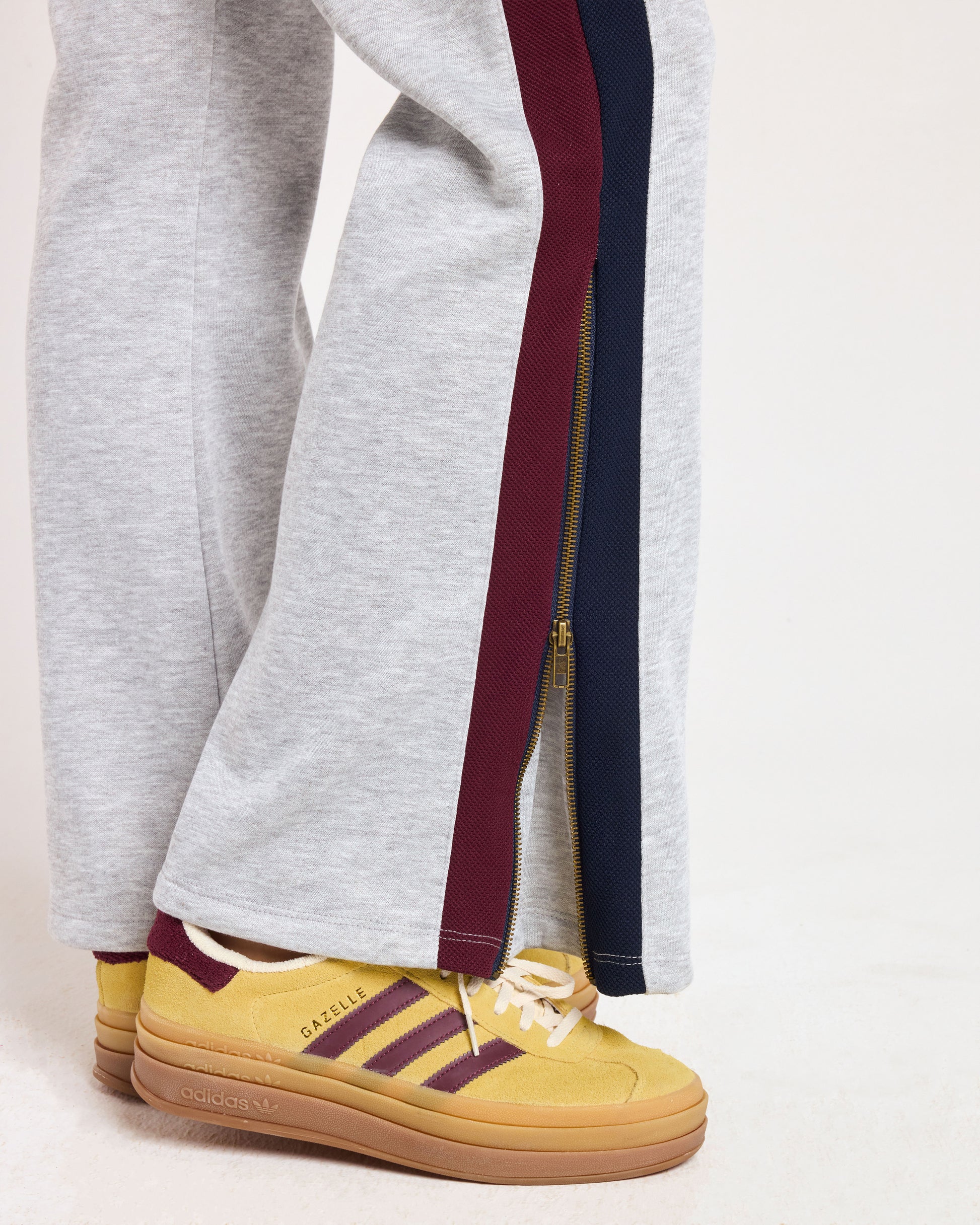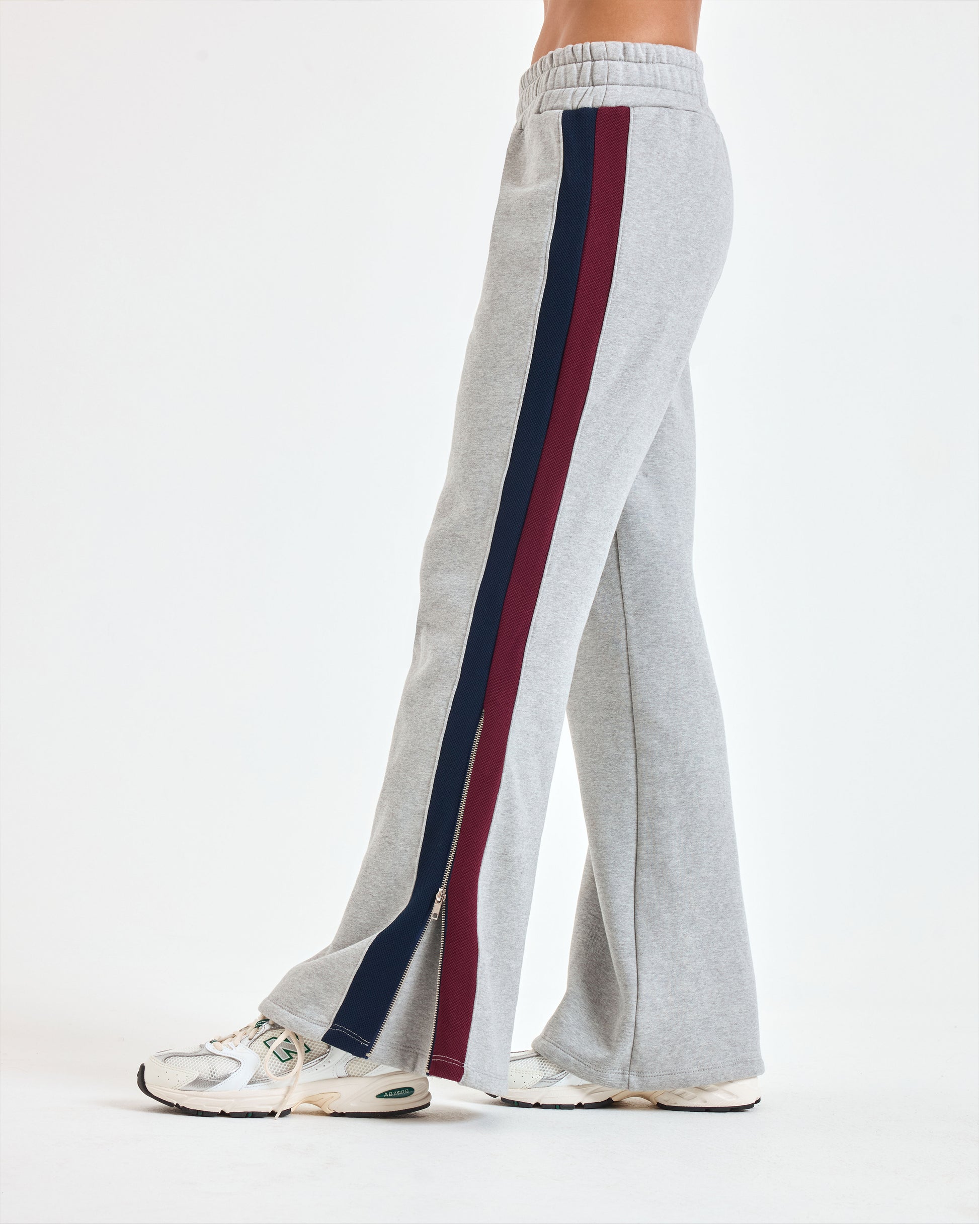 Take a vintage sweatpant, but make it fashion. Features a flared shape with zips at the hem and sporty retro stripes on the sides. Cozy. Fashionable. Done.