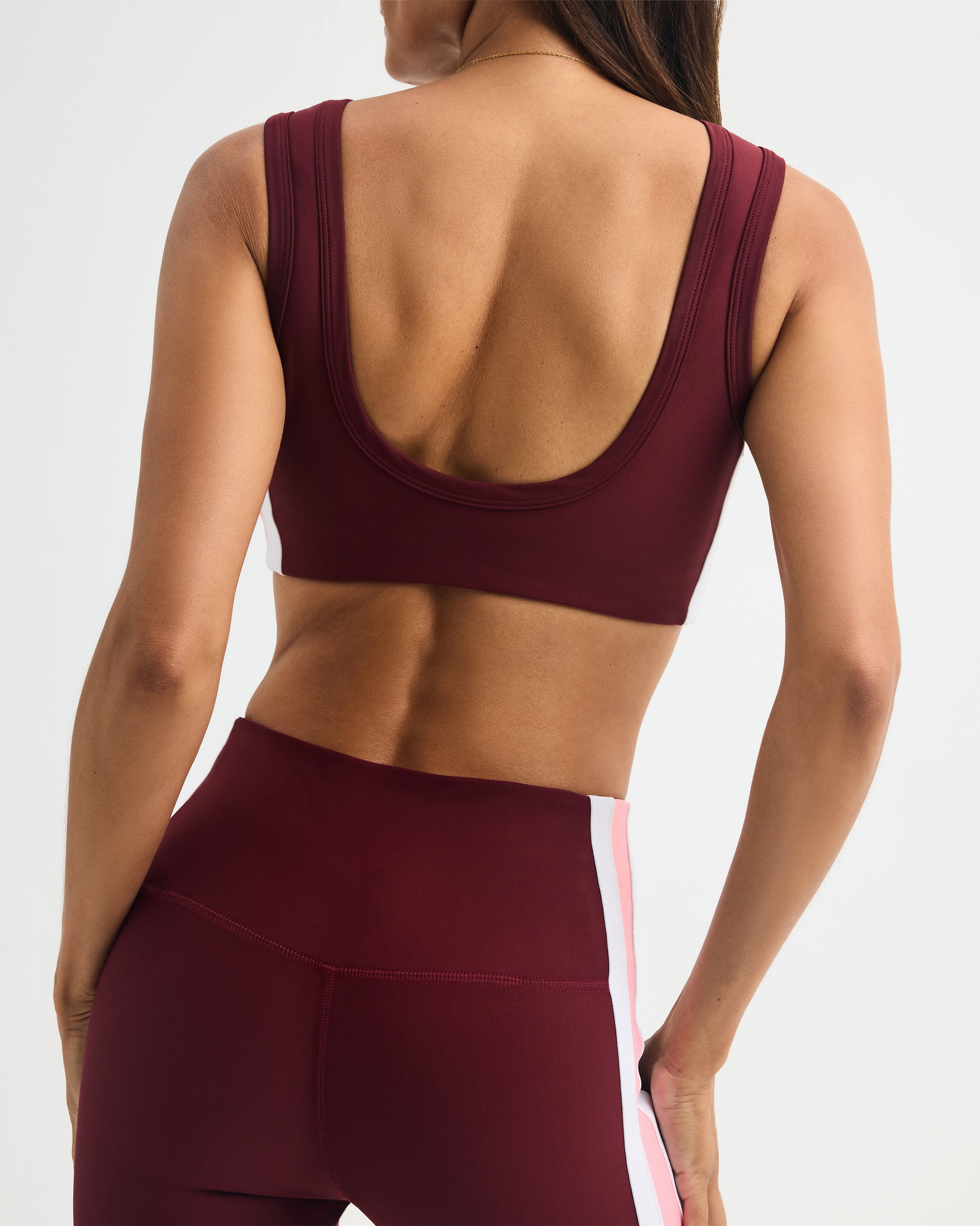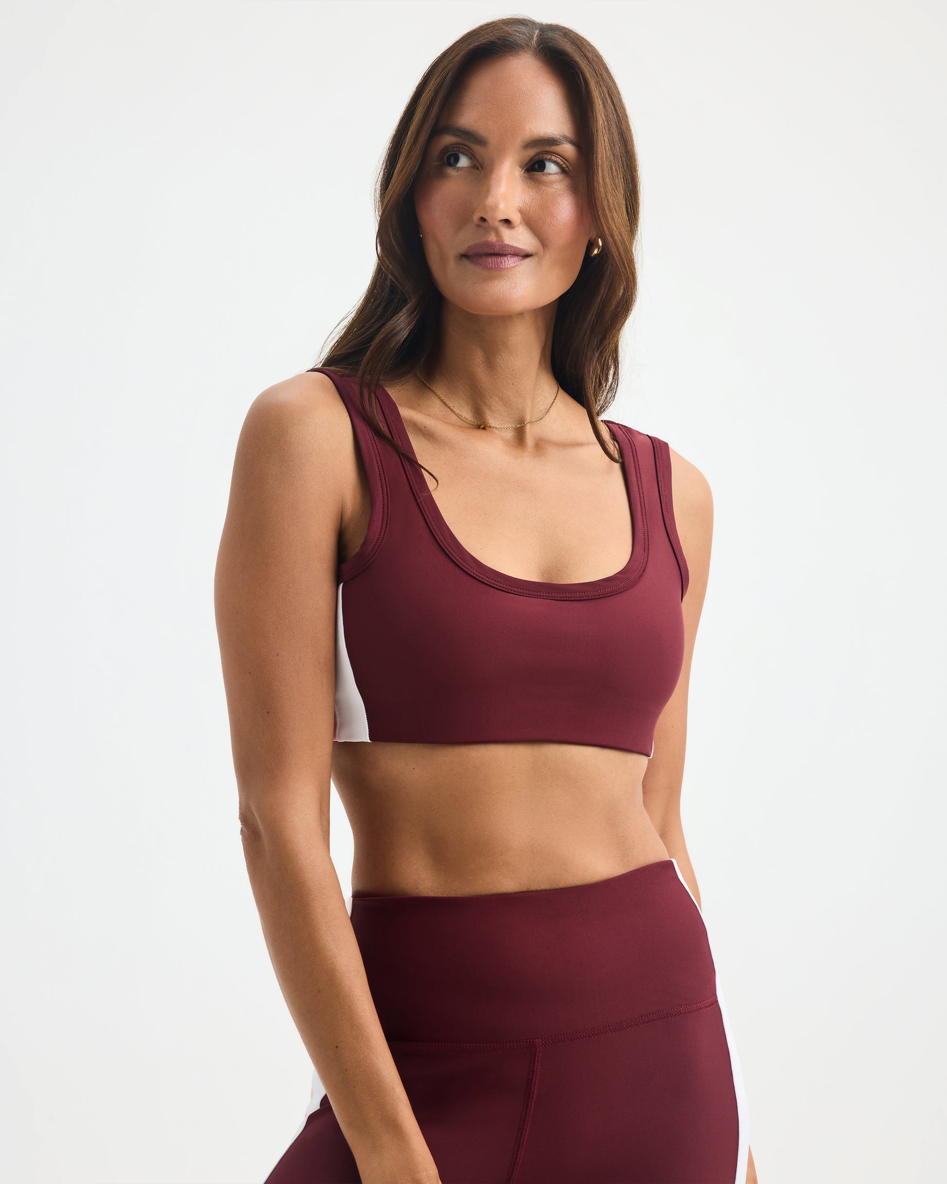 Don’t call it a comeback. This hitmaker is a lightweight and supportive spandex blend performance bra that features a low cut back and retro racer stripe details. Runs true to size.